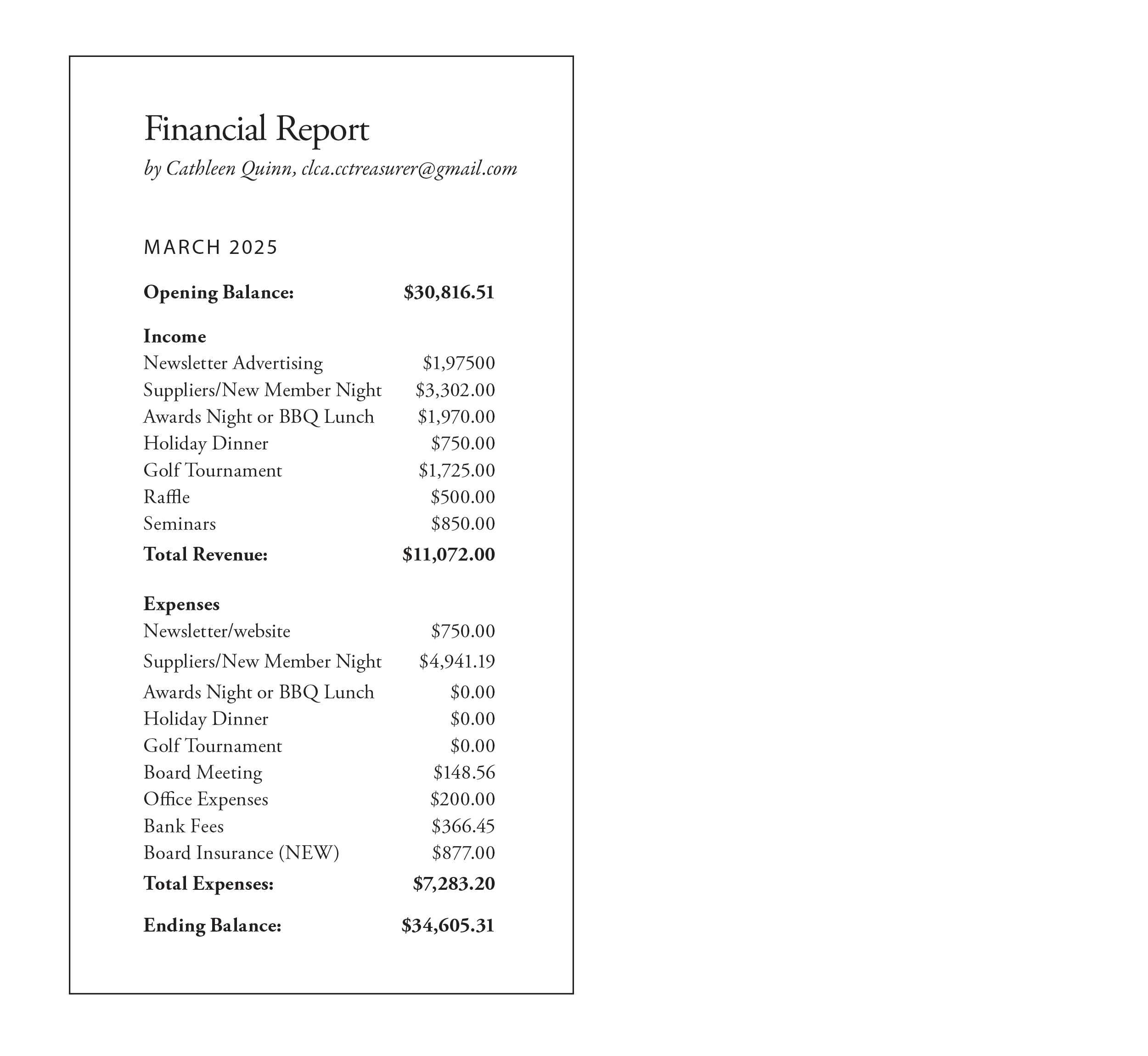 Hope you’re rev’d up because the best is yet to come. We have some great events planned for everyone this year with our annual Suppliers Night right around the corner, March 22, Thursday at The Back Nine. We also have some awesome educational events in the works and much, much more. Stay tuned. You won’t want to miss it!
