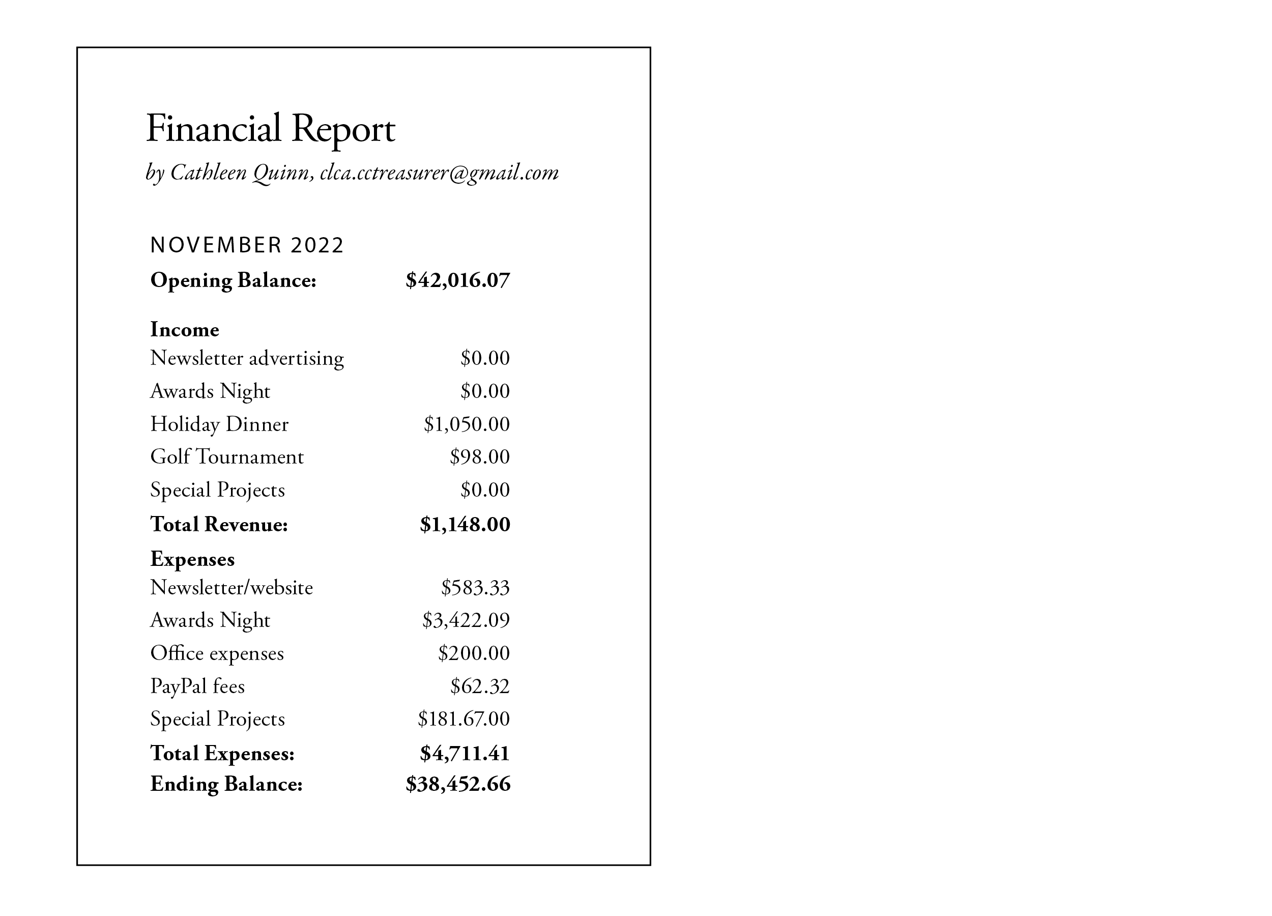 There would be no party without our team of volunteers to make it happen. Thank you to Scott Long from Central Coast Landscaping for leading the charge in finding a suitable location at the Seascape Golf Club in Rio Del Mar to hold our event. Thank you to Gregory and Martha from Green and Growing Landscape for providing the conifer centerpieces and your work at the administration table to welcome our guests. Also we take pride in acknowledging the rest of our board of directors for all their support in making calls to our members to come celebrate the holidays with us and always showing up. Lastly but not least we want to thank Elise Huffman, newsletter editor, graphic artist and chapter rallying instrument, Ki Bowman, media and Cathy Quinn for secretarial support in keeping us relevant and financially sound. We are “ CENTRAL COAST STRONG!” May 2023 be a great year for all!