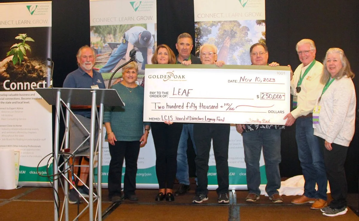 It is with humble pride and great excitement that the Landscape Educational Advancement Foundation (LEAF) announces the $250,000 donation it received from the Landscape Contractors Insurance Services Board of Directors at the 2023 CLCA Convention in Monterey. This donation will establish the LCIS Board of Directors Legacy Fund.