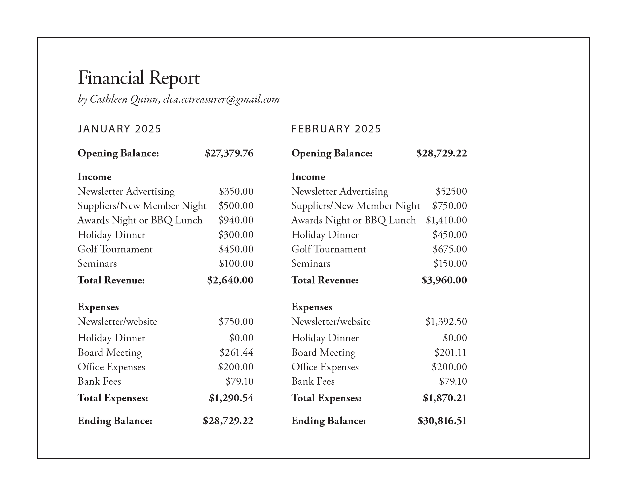 • Newsletter Volunteers needed to write “President’s Messages each month.” Plan to rotate the newsletter message writer among board members