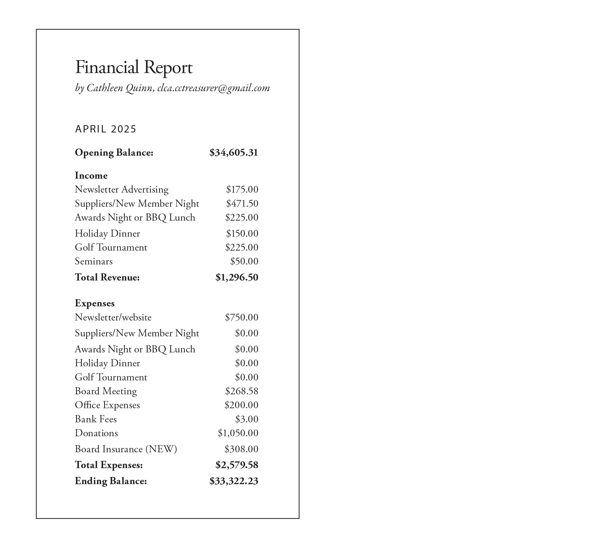 Bookkeeper: Cathy Quinn